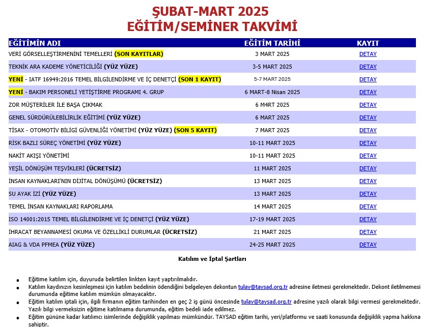 TAYSAD Eğitim/Seminer Takvimi